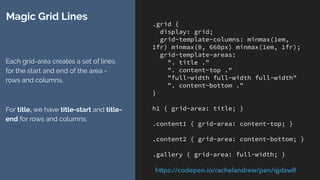 The document summarizes key concepts the author learned about CSS Grid layout. Some key points include: