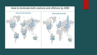 Wind energy is a renewable source of energy that harnesses the kinetic energy of wind to generate electricity. It has the potential to meet a significant portion of the world's energy needs in the future. By 2050, wind energy could account for 35% of global energy production according to some estimates. While wind energy has advantages like being renewable and reducing greenhouse gas emissions, it also faces challenges such as intermittent availability, high upfront costs, and potential impacts on wildlife. Overall, wind power shows promise as a sustainable energy alternative if its challenges can be addressed effectively.