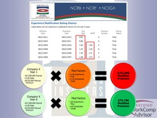 The document discusses workers compensation consulting services, including explaining what an experience modification is and how it can impact insurance premiums. It also outlines several solutions that Business Insurers of the Carolinas provides to help organizations properly manage their workers compensation programs, such as helping with HR documentation, safety inspections, claims management, and experience modification reviews. The company claims it can help clients identify if they have overpaid on insurance premiums and maximize discounts.