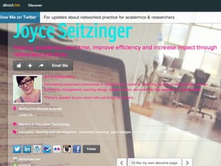 This document provides an agenda and schedule for a workshop on growing research impact through social media. The workshop is led by Joyce Seitzinger and will cover building profiles on Google Scholar, ResearchGate, and Academia.edu. It will also cover using Twitter, LinkedIn, and other tools to connect to research communities and explore how different media are used to share research. Participants will work on preparing a research artifact to share via social media and discuss curation strategies and apps. The goal is to help researchers set up a personal social media strategy to support their work.
